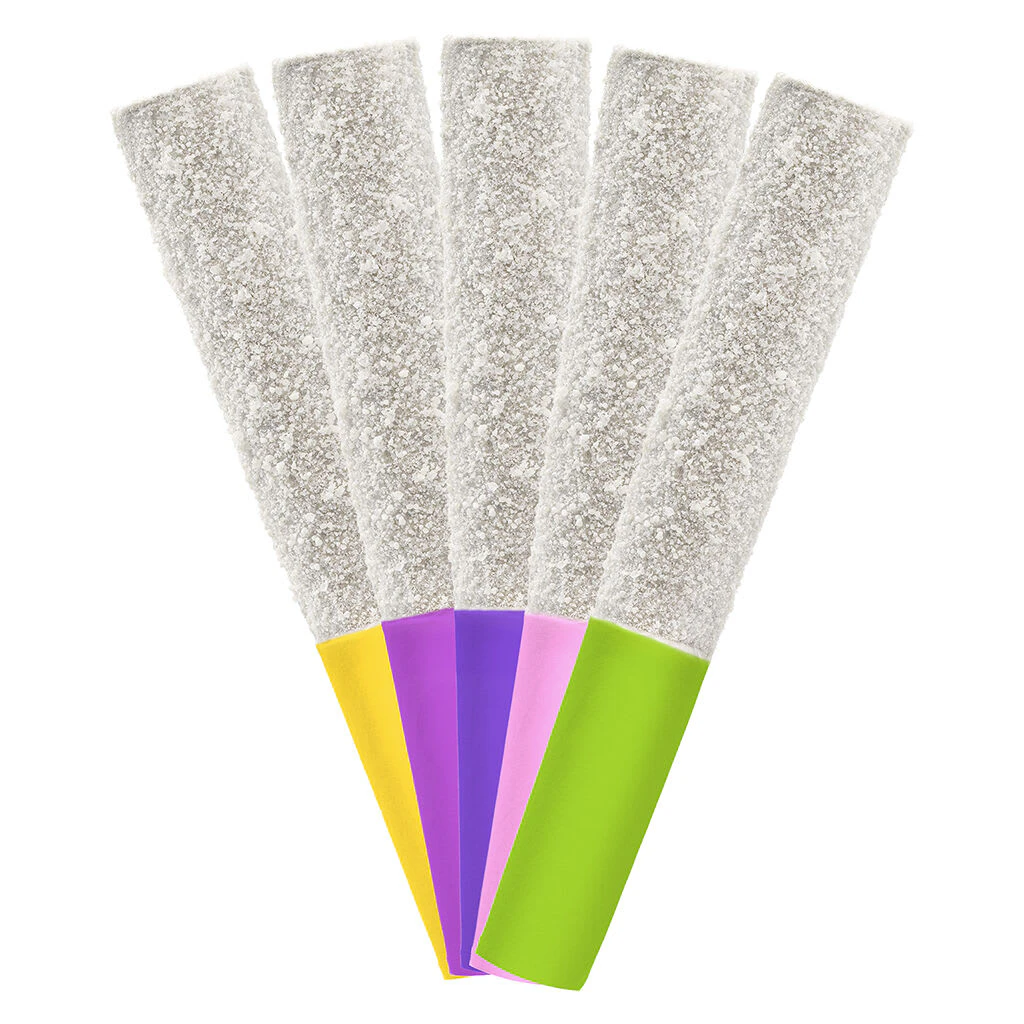 Introducing the Nugz Flavour Bomb Infused Pre-Roll Taster Pack. Five nostalgic, flavour forward, diamond infused pre-rolls packed into one collection. Each pre-roll is meticulously crafted with indoor grown flower, never irradiated, infused and coated with THCA diamonds to deliver an intense, high THC and full flavour experience.